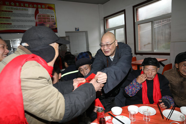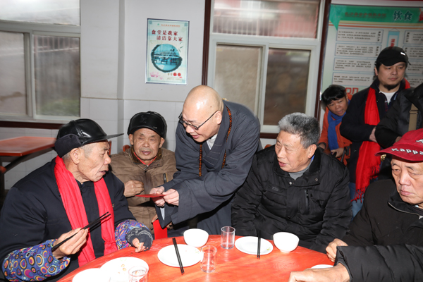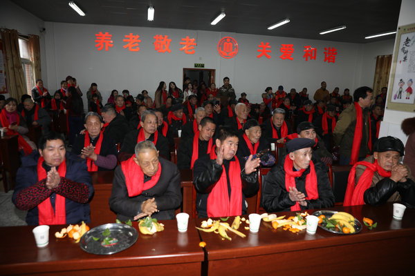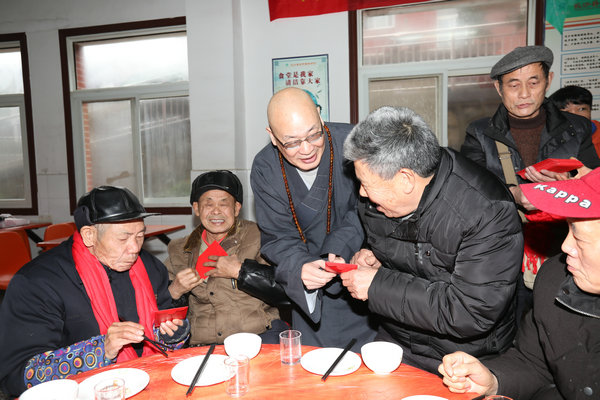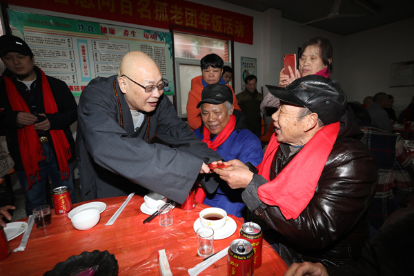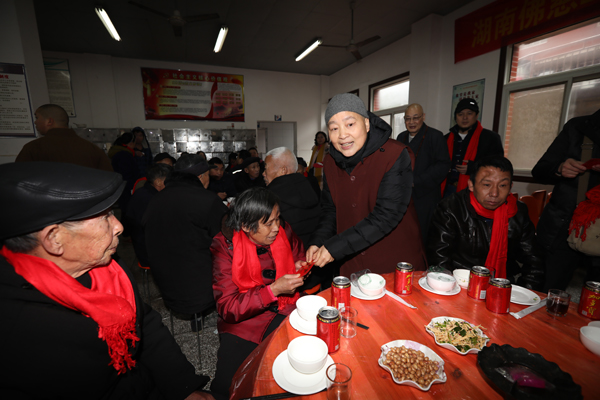 湖南省佛慈基金会工作人员还提前准备好了丰盛的素餐和老人们一道提前吃团年饭。席间,圣辉大和尚向老人们敬茶、送红包,还亲切的询问,这里年纪最大老人是哪一位。并且和大家说:“这些老人是我们的亲人呀!他们年轻的时候都吃了太多苦,辛苦了一辈子,老了没有子女,能为他们服务,尽自己的微薄之力,是我们的责任和义务,从中我们也感受到了快乐,以后要动员更多的人加入到慈善活动中,传递社会正能量,弘扬敬老、爱老、助老的好风尚!”