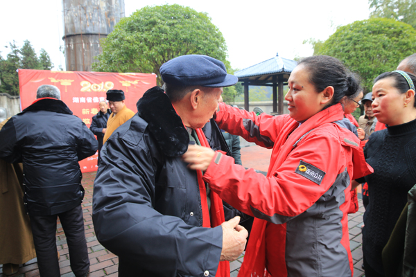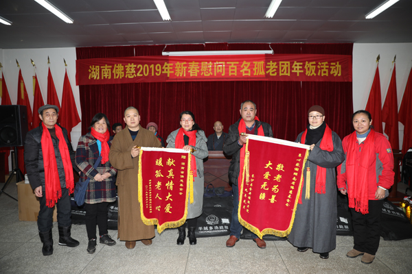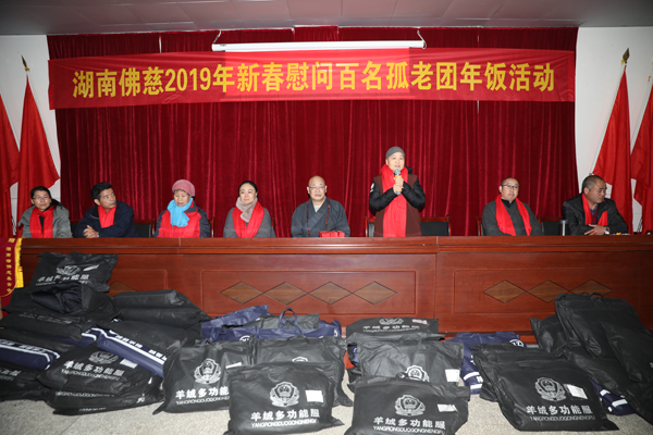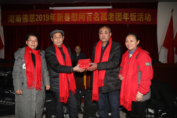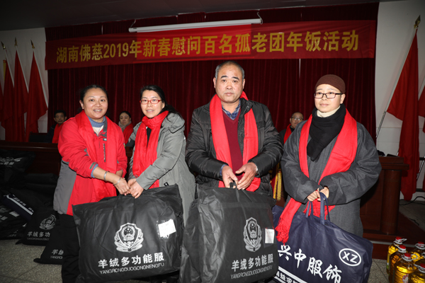 文艺表演结束后,现场举行了捐赠仪式,湖南省佛慈基金会为来自两个敬老院的130多位孤老,奉上了春节红包、过冬的新棉衣、围巾、食用油、水果、生活用品等物资,累计捐赠善款及物资合计67536元。