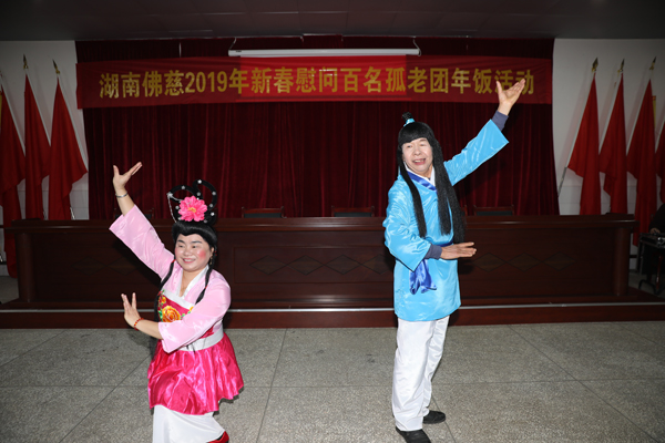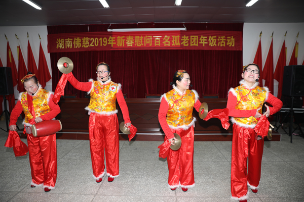 2019年1月19日上午,冬日的寒风冰冷,但长沙县金井镇敬老院的会议室里却是一派热闹温馨的场景。在圣辉大和尚的带领下,湖南佛慈的工作人员及众多居士会员和志愿者等,在这里提前向居住在金井镇金井敬老院和双江敬老院的孤寡老人们,开展了“湖南佛慈2019年新春慰问百名孤老团年饭活动”。于此同时,志愿者们还精心为老人们准备了一台精彩的文艺节目,现场表演了载歌载舞的黄梅戏、敲锣打鼓的三句半、茉莉花乐曲伴随着翩翩起舞的《团扇舞》、异国风情的手鼓表演《一瞬间》、文采飞扬的诗朗诵,节目主要以歌舞为主,全是志愿者们自编自演。随着节目的轮番上演,老人们看得很开心,不断鼓掌助兴。最引人入胜的还要算现场互动环节,平日里沉默少语的老人们也和志愿者们一起开心的来了一把《脑筋急转弯》。