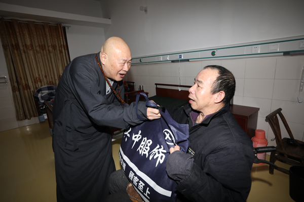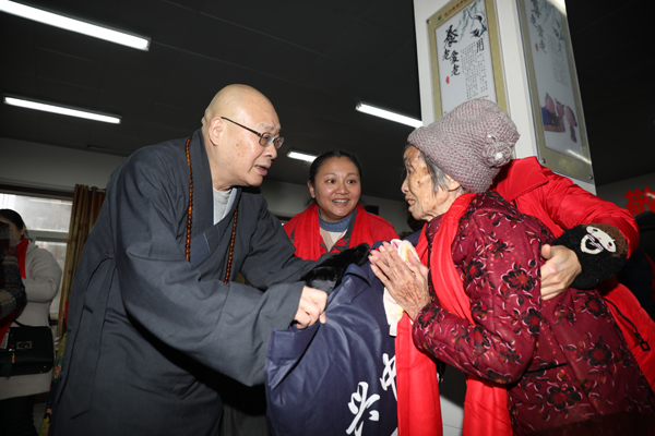 当得知有一些失能老人因为行动不方便,不能走出房间出席活动现场后,圣辉大和尚亲自带着礼物和红包走进了老人们的房间,为他们逐一送去了亲切问候。