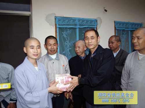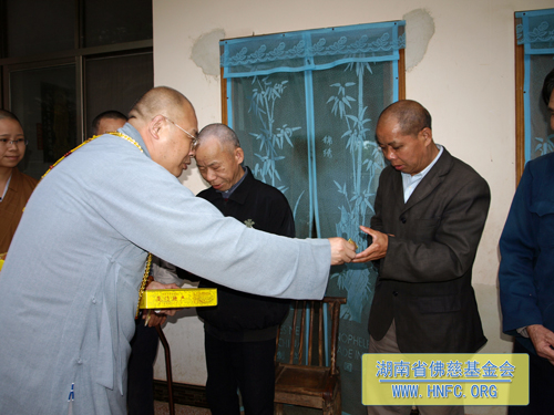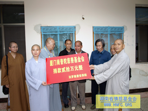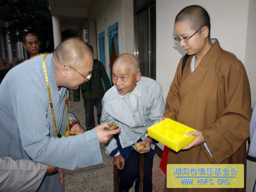 5月27日, 湖南省佛慈基金会、厦门南普陀寺慈善会会长圣辉大和尚率领定通法师、静仁法师和我基金会知证法师及周仲山秘书长一行,于端午佳节前夕来到湖南省汩罗市崇善安养院,慰问生活在那里的二十几位孤寡老人,并为他们送去了南普陀素饼,祝愿老人们端午节快乐,同时捐赠崇善安养院20万元善款,以改善老人们的生活条件,让他们在安养院幸福、舒心的安享晚年。