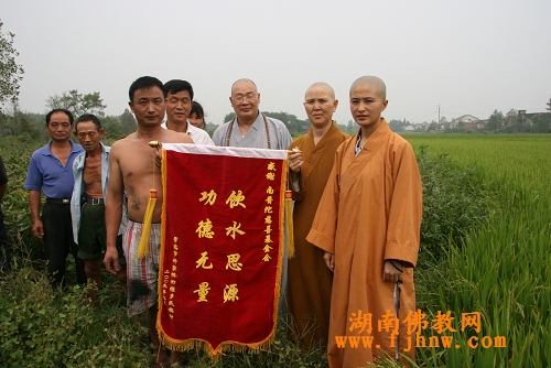 民族村是湖南省常德市鼎城区许家桥回族维吾尔族乡唯一的纯少数民族村,全村人口1058人,350户,地处洞庭湖尾段,属血吸虫疫区。受上段麻家巷墟场、集镇污水及牛场废水排放的影响,民族村水源受到严重污染,造成人畜饮水困难。今年民族村又遭受了严重的水灾,村民的生活用水无法保障。圣辉大和尚对此情况非常重视,关心少数民族同胞的生活,立即决定拨资10万元支援民族村筹建自来水厂。此举为当地农民解决了饮用水的困难问题。湖南省佛慈基金会捐助二万元用于加固回族维吾尔族乡水库水坝的资金。