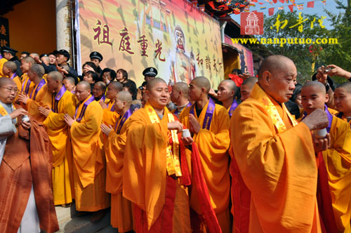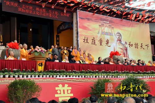 上午8时30分,石霜寺钟鼓齐鸣,住持照性法师率仪仗队出山门迎接诸山长老和各级领导、各届人士至大雄宝殿礼佛。9时30分,“拜祖庭、弘文化、促和谐”系列活动开幕式在大殿前隆重举行,与会嘉宾在主席台就坐,随喜观礼的护法善信人山人海,法会现场祥和热闹。在主持人正兴法师、大智法师介绍嘉宾名单之后,《国歌》、《三宝歌》和本次活动主题歌《诸佛佑神州》相继响起,宣布了“庆国庆、走江湖、拜祖庭、弘文化、促和谐”等系列活动正式开幕。