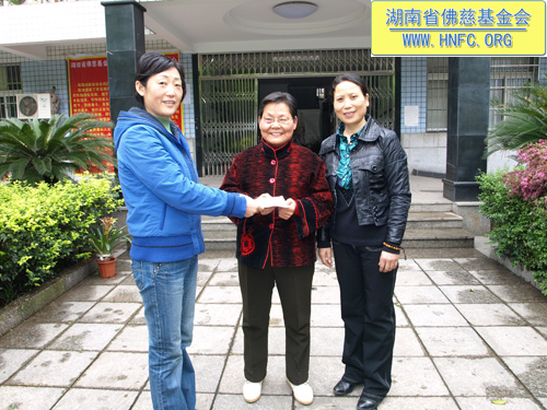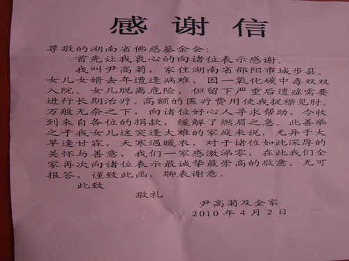 城步苗族自治县人尹高菊是佛慈基金会会员,她的三女儿杨利华以及女婿陈和宇都是下岗职工。2010年元月1日在北京市海淀区打工住的出租屋内,两人因一氧化碳严重中毒。女婿至今一直昏迷不醒。每天需要用上几千元的治疗费。女儿经抢救后丧失记忆力,生活不能自理,实在无力承受高额医疗费用。她只得请求湖南省佛慈基金会给予救助。2010年4月1日,会长圣辉大和尚得知情况后嘱咐佛慈基金会救助他们。虽然只有三仟元钱,但代表了所有会员们的一片爱心,我们真心地祈祷希望他们能化危为安,早日康复。同时也希望更多的善心人加入到慈善行列中来,救助更多的弱势群体。