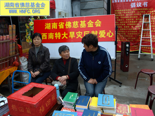 2010年4月2日,正值观音菩萨圣诞,前来拜佛的人络绎不绝。湖南省佛慈基金会在正门举行为西南特大旱灾募捐活动,这次活动吸引了众多的善心人士。他们从电视上得知西南地区的同胞们正处在极度干旱的境况中,都纷纷解囊捐出善款,表达自己的一份爱心。众人拾柴火焰高,聚少成多,大家一起愿“一滴水汇聚成爱的汪洋,一份情凝聚成无穷力量!”给灾区人民送去希望的甘泉。