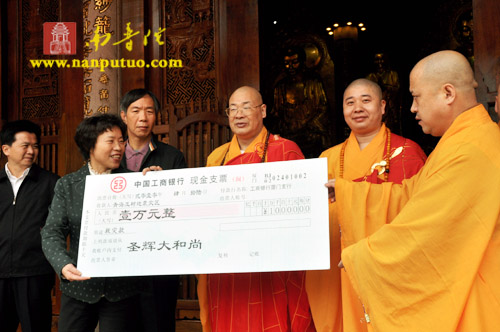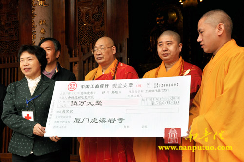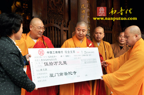 此次赈灾募捐,南普陀寺捐赠50万元,南普陀寺慈善会捐赠10万元,厦门虎溪岩寺捐赠5万元,圣辉大和尚个人捐赠1万元。法会现场游客也积极响应,纷纷慷慨解囊,奉献爱心,共同祈愿灾区人民早日度过难关。今日所募善款将由厦门市红十字会转交灾区。