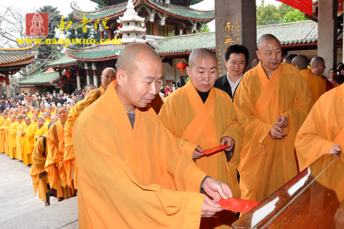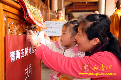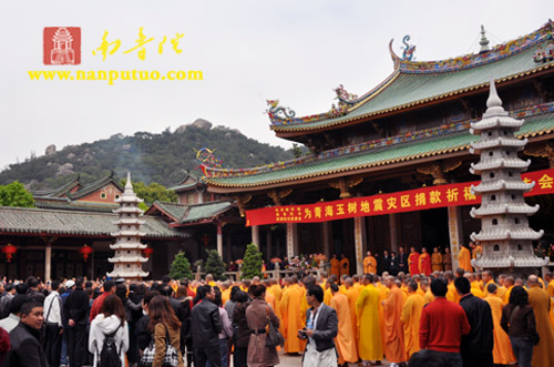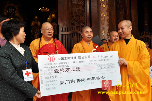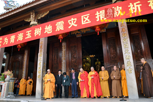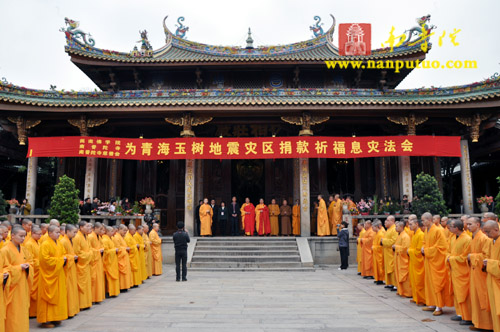 2010年4月16日上午9时50分,“闽南佛学院、南普陀寺、南普陀寺慈善会为青海玉树地震灾区捐款祈福息灾法会”在南普陀寺大雄宝殿前举行。中国佛教协会副会长、闽南佛学院院长、南普陀寺法主圣辉大和尚,厦门市佛教协会会长、南普陀寺方丈则悟大和尚,厦门市佛教协会常务副会长定恒法师,南普陀寺监院界象法师,南普陀寺慈善会常务副会长慧然法师,厦门虎溪岩寺监院净心法师,厦门市红十字会副会长兼秘书长李明珠女士以及闽南佛学院全体师生参加本次法会。法会由界象法师主持。