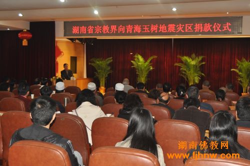 湖南佛教网讯:2010年4月20日上午,湖南省宗教界发起向青海玉树灾区捐款活动在省宗教局举行。4月14日,青海玉树发生7.1级强烈地震,给灾区同胞造成了巨大的创伤和痛苦。湖南省宗教界人士积极发起向青海玉树灾区捐款活动,向灾区人民伸出友爱之手。捐款活动由省宗教事务局汤新华局长主持,省长助理袁建尧、中国佛教协会副会长、湖南省佛教协会会长、长沙麓山寺方丈圣辉大和尚都分别作了讲话,希望宗教界继续发扬慈爱友善的精神,为社会的和谐发展作出更多的贡献,并带头为青海玉树灾区捐款。