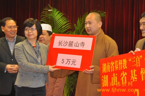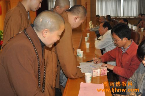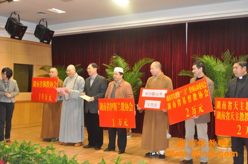 湖南省佛教协会、湖南省佛慈基金会捐善款10万元﹑长沙市佛教协会、邵阳市佛教协会、长沙麓山寺、开福寺、洪山寺、铁炉寺、宝宁寺、祁东万福寺现场共捐款30多万元。