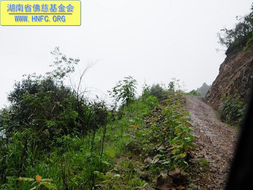 通往麻风村公路全程为泥石水沟,简易涵洞,无一处挡土墙及护坡等防护设施,而且坡长路陡,弯急。遇到几次自然灾害现损毁严重。圣辉大和尚心系弱势群体,吩咐湖南省佛慈基金会和厦门南普陀寺慈善会筹资7万元用于麻风村修复水毁公路,解决运输生活用品和药品难问题。