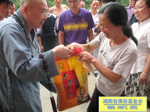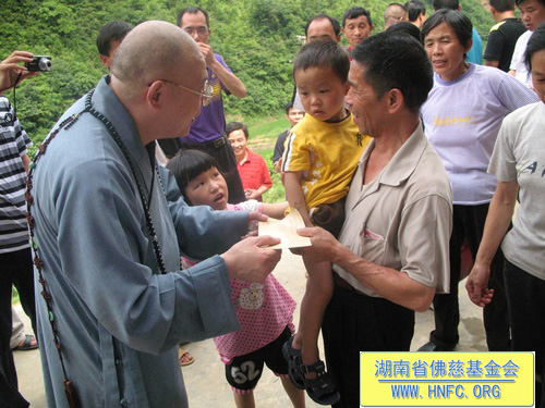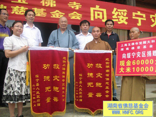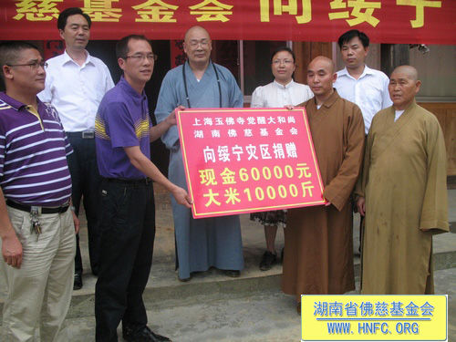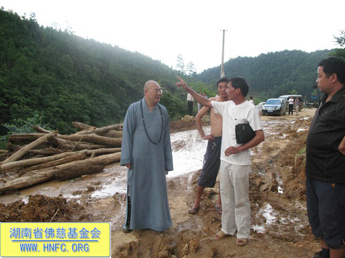 2010年6月29日,“救灾济困慈善行”一行在全国人大代表、中国佛教协会副会长、湖南省佛教协会会长、福建厦门南普陀寺慈善会会长、湖南省佛慈基金会会长圣辉大和尚的带领下,来到了受洪涝灾害比较严重的邵阳市绥宁县枫木团乡。圣辉大和尚看到被泥石流冲毁的房屋及田地,感到痛心疾首:我们在灾区人民最困难的时候扶助一把,才能使他们振作起来走出困境。湖南省佛慈基金会和上海玉佛寺在当天举行了向绥宁灾区捐助仪式,资助200户灾民,每户300元,另50斤大米。共捐助现金8万元。圣辉大和尚还亲自把钱和米送到灾民的手中,并安慰他们一切都会好起来的。