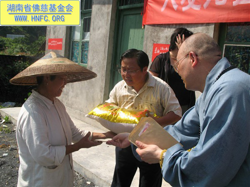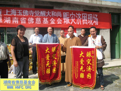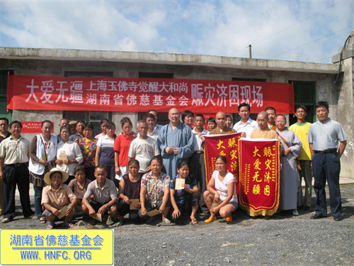 “救灾济困慈善行”一行人员迎着烈日到达了为期一周慈善行的最后一个站点湘西古丈。因为原计划要去探视的受灾现场,再次发生道路塌方,我们不能如期到达,决定前往离县城不远,同样也受灾严重的龙潭村探访。到达现场后就举行了捐助仪式,湖南省佛慈基金会和上海玉佛寺觉醒大和尚共同捐助古丈受灾特困200户,每户300元,另发50斤大米,共捐善款8万元,特委托古丈县副县长以及古丈县宗教局送达受灾户手中,当地领导代替受灾民众表示感谢回赠了锦旗。
