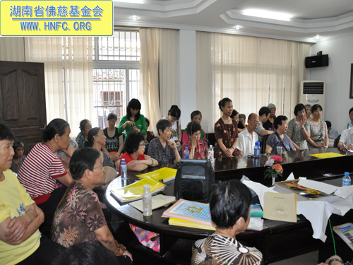 各位居士!你们不是一般的居士,基金会成立以来,做了整十年的功德,大家十分辛苦也有成绩。今年5月以来湖南十轮强降雨,各地洪涝灾害严重。我们还与红十字会一起成立“救灾济困慈善行”到了十几个灾区,资助了两千多户灾民,每户资助了300元和50斤大米。一共募集到80万元善款,这次救灾是基金会成立以来最大的一次。基金会这十年以来的成绩很大,我自己也很感动。这次在麻风村有从外地来的义工,他们自己带了钱还与病人一起生活。麻风病人受到歧视不能出山区。这些年轻的和年老的义工不怕传染,照顾病人。这些人的境界都很高,我们帮麻风村修了公路方便他们运送食物和药品,尽力帮麻风村解决困难。