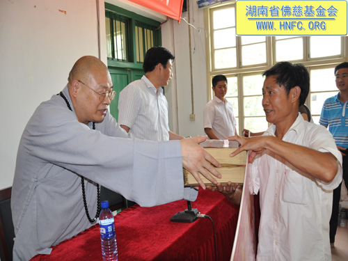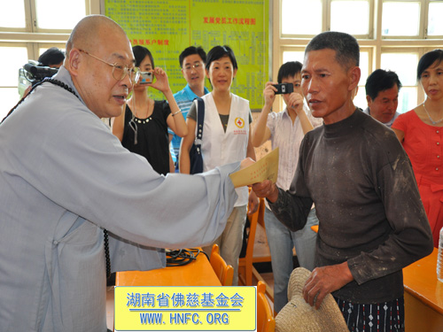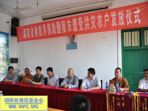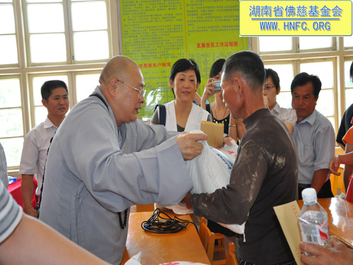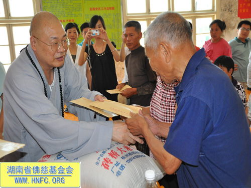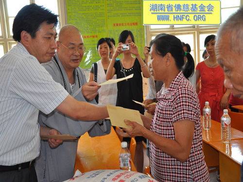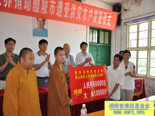 中午圣辉大和尚一行到达醴陵石亭镇府,当即就举行了捐助仪式。湖南省佛慈基金会和南岳上封寺怀泉大和尚共同筹集资金向醴陵石亭镇受灾的200户村民进行了捐助,每户给予300元现金,另发50斤大米,共捐善款8万元。