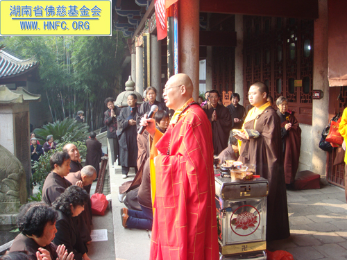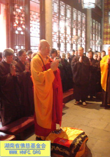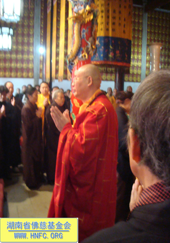 九点整法会正式开始,中国佛教协会副会长、湖南省佛教协会会长、古岳麓寺方丈、湖南省佛慈基金会会长圣辉大和尚作了精辟的开示,激励广大的基金会会员们学药师佛的精神拔众生苦,用大悲心来行菩萨道。