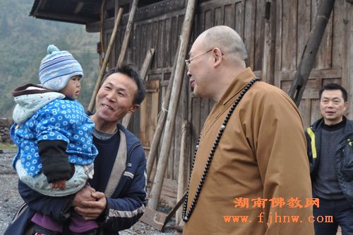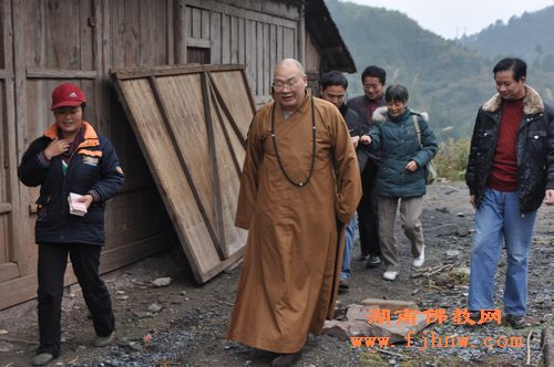 湖南佛教网讯:2010年12月26日下午,中国佛教协会副会长、湖南省佛教协会会长圣辉大和尚到泸溪县资助灾民。此次资助的灾民是“善行2010抗洪救灾济困慈善行之泸溪慈善行”中,一户被洪水把家里东西全部冲毁的家庭,圣辉大和尚承诺单独资助两万元,用于住房的建造。现在新建的房屋已经建好,圣辉大和尚亲自将两万元善款送给他们,希望能帮助他们家解决目前的困难。