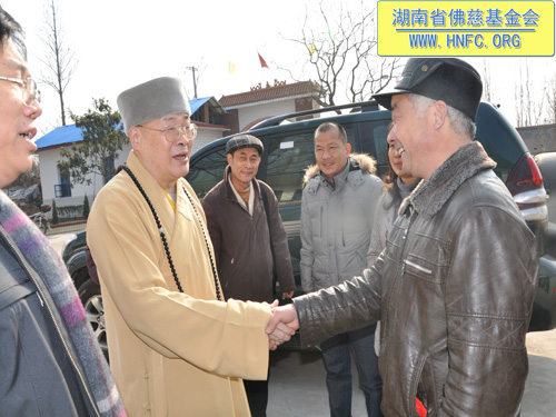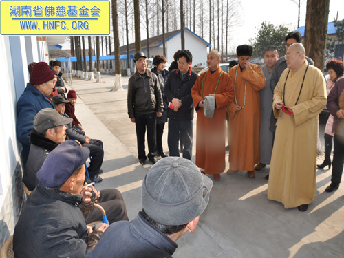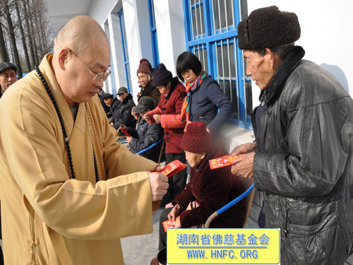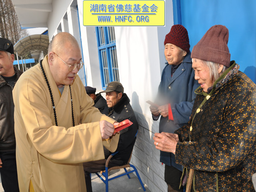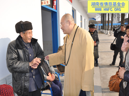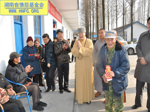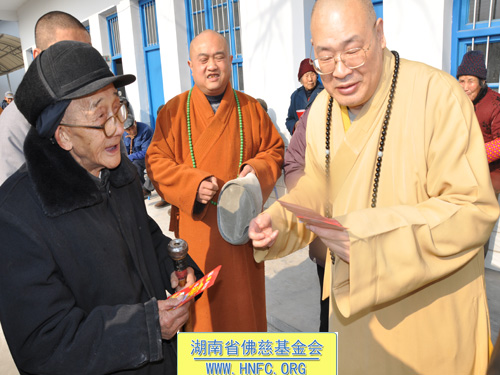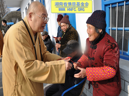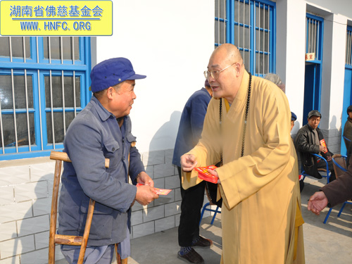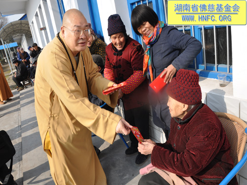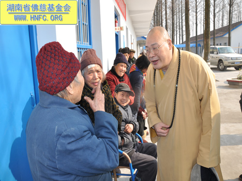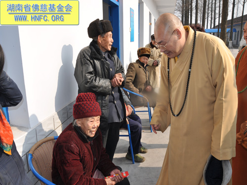 2011年1月16日上午九点,中国佛教协会副会长、湖南省佛教协会会长、湖南省佛慈基金会会长圣辉大和尚带领湖南省佛慈基金会工作人员,年终到益阳南县中鱼口乡敬老院慰问并看望了58位孤寡残疾老人,给予每人200元的年终慰问红包。衷心希望老人们过一个愉快的春节。圣辉大和尚关心的询问高寿老人的生活起居和健康状况,并嘱托敬老院的院长照顾好每位老人,让老人们度过安康的晚年。