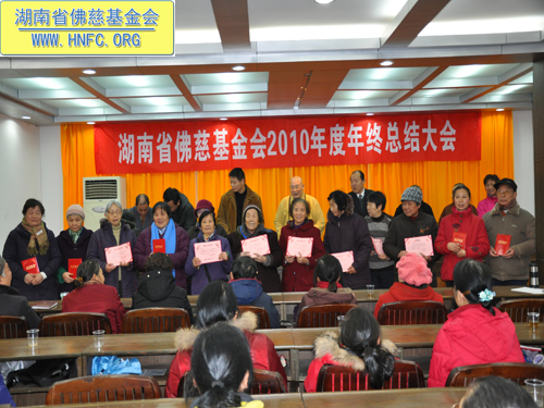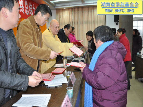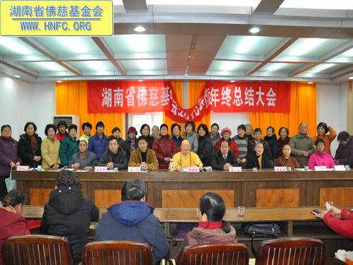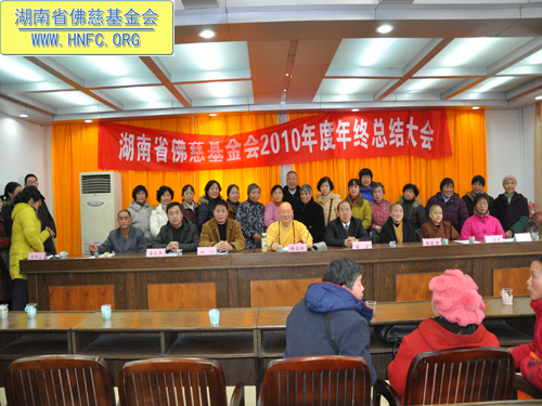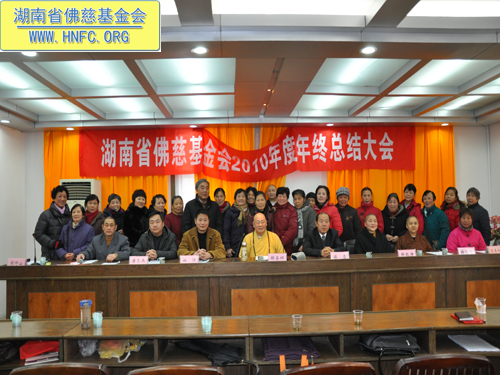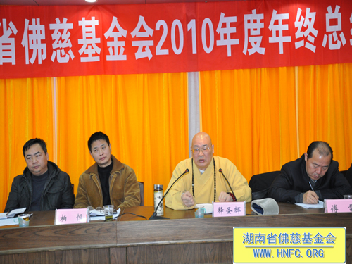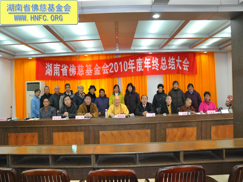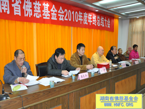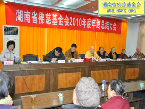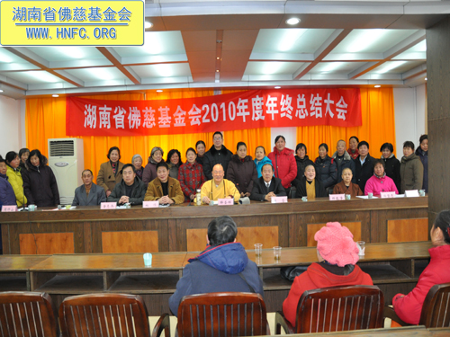 2011年元月18日,湖南省佛慈基金会召开了2010年度年终工作总结会,全国人大代表、中国佛教协会副会长、湖南省佛教协会会长、湖南省佛慈基金会会长圣辉大和尚,湖南省佛慈基金会副会长能净法师、坚愿法师,湖南省宗教局傅雷副局长、柏桓处长、唐志兵副处长,省佛协居士委员会陈春香主任参加了会议。会议由省佛慈基金会秘书长周仲山主持,省佛慈办公室主任曹银艳把2010年终工作总结以及2011年工作设想,向各位领导以及组长做了汇报。