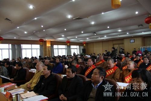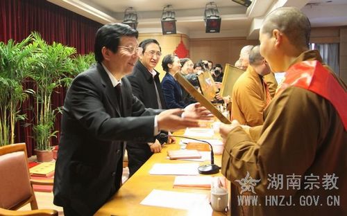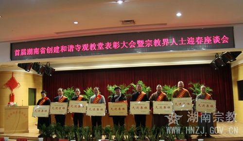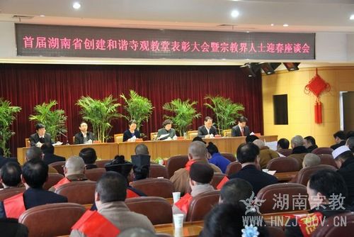 省佛教协会会长圣辉、省道教协会副会长马涌奇、省伊斯兰教协会会长张光耀,省天主教爱国会主任胡亚力、省基督教协会会长陈郅分别汇报了2010年工作情况,介绍了2011年工作计划,都立足本教特点,结合我省实际,总结过去,谋划未来,作了精彩的发言。省委统战部副部长孙剑霖宣读了首届全国创建和谐寺观教堂先进集体和先进个人的表彰名单,省宗教局局长汤新华宣读了首届湖南省创建和谐寺观教堂先进集体和先进个人的表彰决定及名单;省领导给先进集体、先进个人代表颁发了牌匾和证书;岳阳市民宗局和长沙市基督教城南堂作为受表彰代表进行了典型发言。