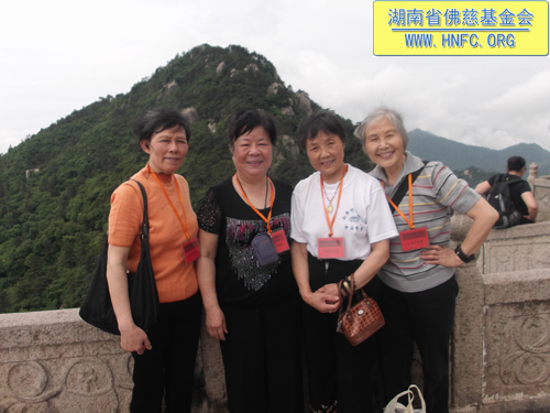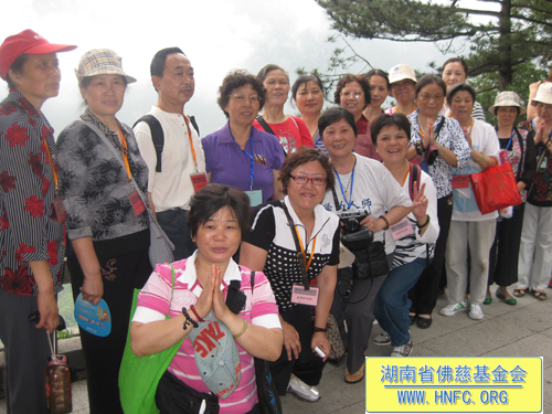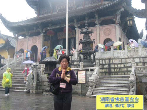 到达九华山的第二天,众居信士在佛慈工作人员彭学静、曹银艳、闵晓红的带领下,顶着大雨首先前往祇园寺拜佛,69位居信士虔诚地在祇园寺供了罗汉斋一堂。下午又冒雨前往化城寺拜佛。第三天大家来到地藏王菩萨肉身宝殿朝拜。居信士们感应着地藏菩萨的慈悲加持,满怀着对地藏菩萨的感恩之情,在佛前发誓:要生生世世报佛恩,发愿学地藏王菩萨百千方便化度众生,不度尽地狱里的受苦众生,誓不成佛;愿我们生生世世不离善知识,常依善友,发大菩提心令无边有情不堕恶道;发愿尽寿形坚定护持如来圣教,使正法永远长久住世。