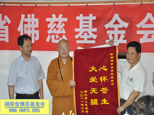 2011年6月24日上午,中国佛教协会副会长、湖南省佛教协会会长、湖南省佛慈基金会会长、湖南省红十字会副会长圣辉大和尚亲自带领的“善行2011湖南佛教救灾帮困慈善行”,第二站到达了湖南省娄底市新化县。为新化150户受灾群众带去湖南省佛慈基金会及湖南红十字会的祝福和每户给予350元现金、大米50斤,共计价值65850元的资助。其中包括:长沙市佛教协会资助5万元,湖南省佛慈基金会资助15850元。