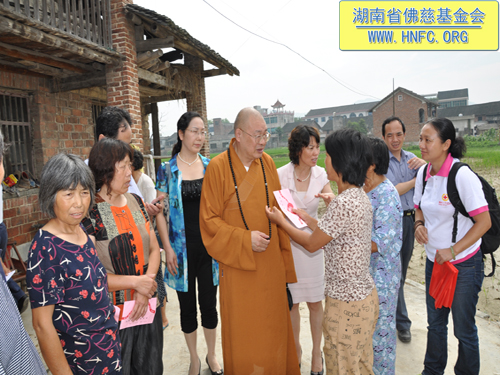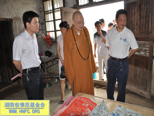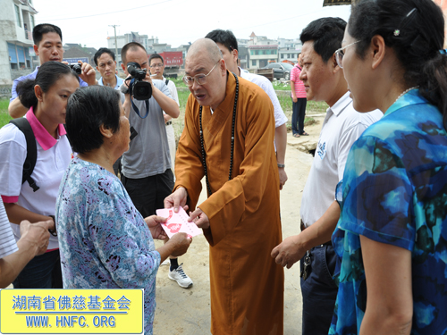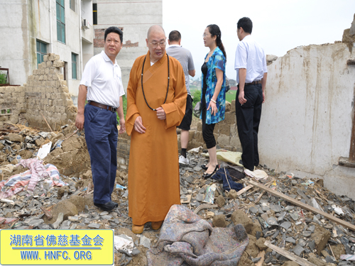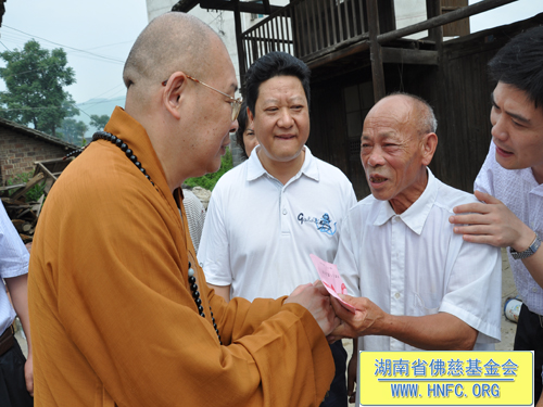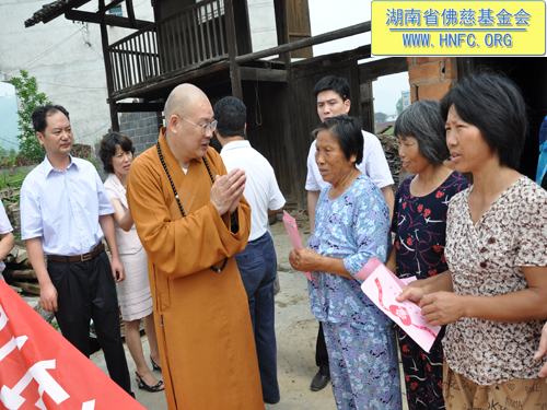 捐助仪式过后,圣辉大和尚要求,前往此次受灾严重的新化县沙江镇第一现场,看望受灾群众。当来到75岁的陈莲娥家,得知她家里房子全倒的情况后,亲自送上了慰问金,并交待务必持续关注这位老人的生活情况。