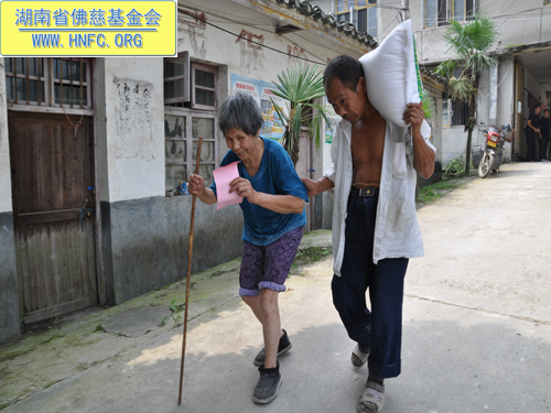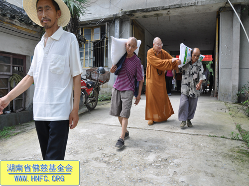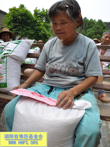 64岁的盲人婆婆向奎年,接到圣辉大和尚亲手赠送的爱心善款和大米后,掩饰不住心里的快乐,满脸堆笑的反复抚摸着大米。一位80多岁的奶奶,领到大米后用背篓背着往大门外走,大和尚不放心的跟了出去。一路招呼沿途的年轻人,把老人送回家。看着大家相互搀扶带着刚刚收到的善款及大米回家的背影,在场所有的人都感受到了他们的开心和欢喜。
