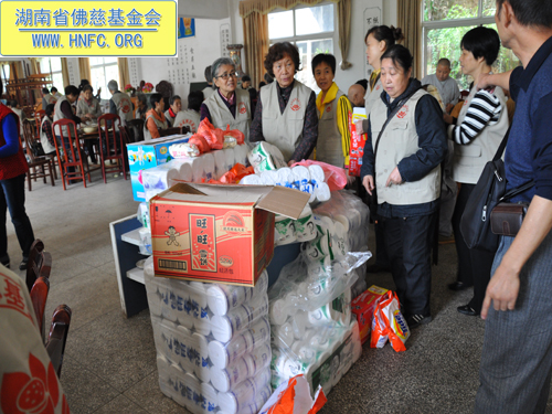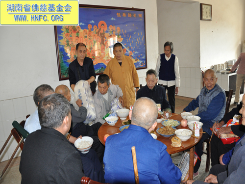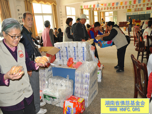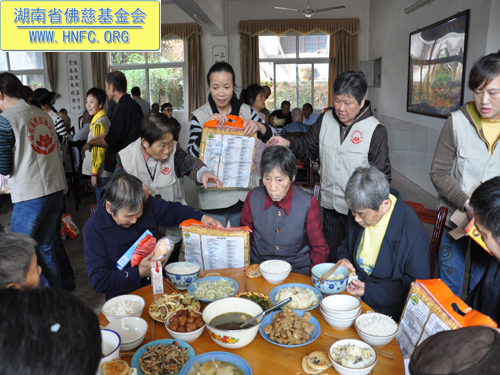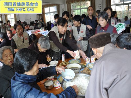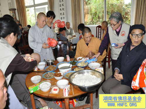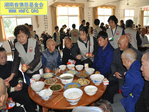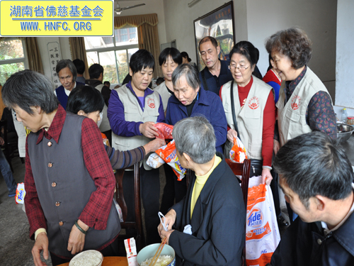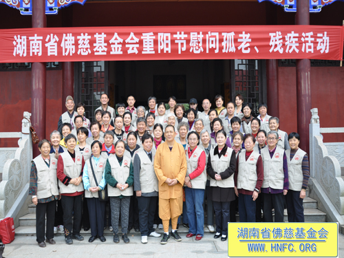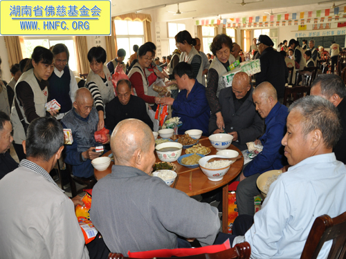 2011年10月5日是农历九月初九重阳节,上午七点,湖南省佛慈基金会在会长圣辉大和尚的嘱咐下,带领众会员赴汨罗崇善安养院慰问那里的孤寡老人。我们的会员为老人们准备了众多的日常用品牙膏、洗衣粉、香皂、纸巾、饼干、苹果等等,还从家中带了很多吃的东西,让安养院所有的老人过一个喜庆祥和的节日。