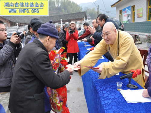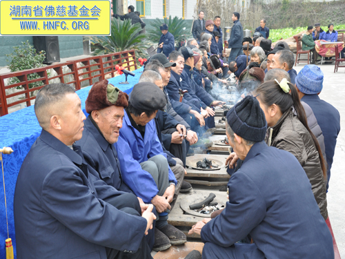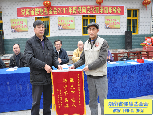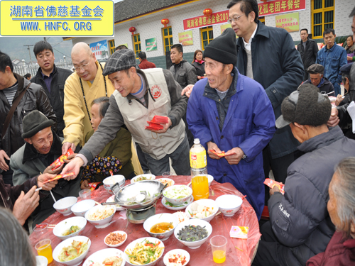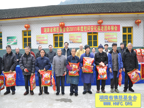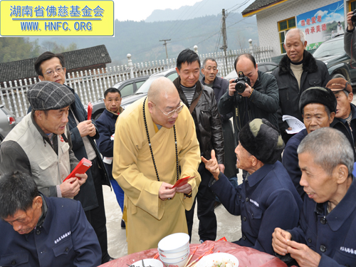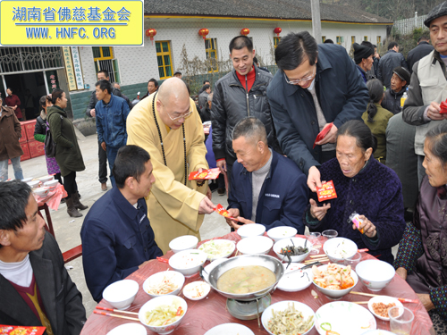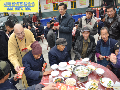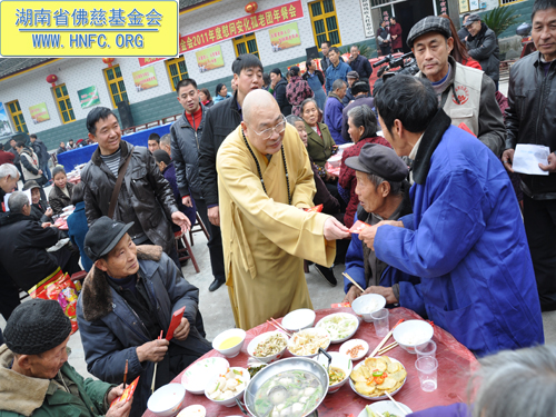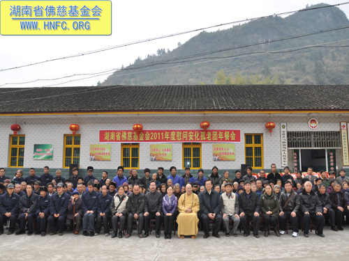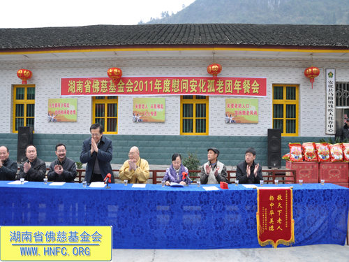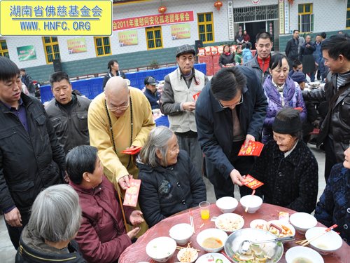 在安化县马路镇敬老院内设素席17桌,请150位当地残疾孤寡老人吃团年饭,给予他们每人200元慰问红包,共资助善款36080元,还给他们每人发了一袋大礼包。圣辉大和尚在席间做了重要的开示,首先敬天下老人,扬中华美德,向残疾孤寡老人们致以年终的问候。并表示省佛慈会长期关注残疾孤寡老人,多给他们送温暖,让孤寡老人们有一个幸福的晚年。最后祝老人们健康长寿,安度晚年。