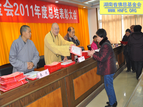 副会长能净大和尚也对湖南省佛慈基金会的慈善工作做了肯定。会上圣辉大和尚给组长、骨干们颁发了奖状,还给每人象征性的发了一个吉祥红包。全体与会人员兴致勃勃地合影留念。