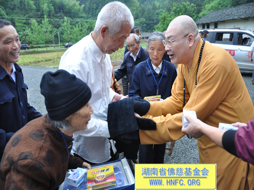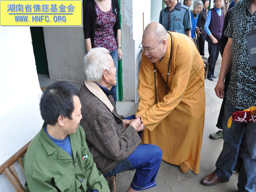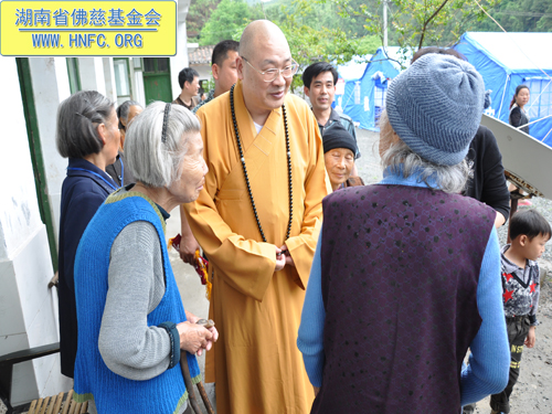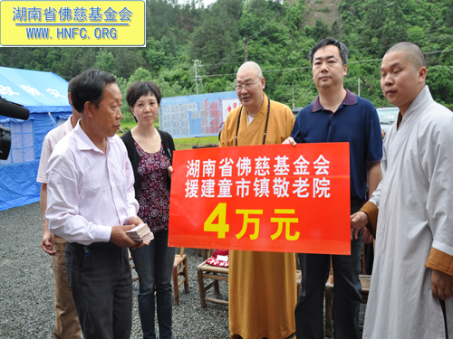 2012年5月9日上午,中国佛教协会副会长、湖南省佛教协会会长、湖南省佛慈基金会会长圣辉大和尚冒着大雨亲自带领湖南省佛慈基金会2012救灾助残帮困慈善一行,第一站到达了湖南平江县童市镇,看望慰问了遭受4.28风雹灾害的童市镇恩溪老人院的受灾老人们,给他们送去了新衣物及数种生活用品,共折合人民币2.5万元。同时还捐助4万元,用于帮助重建童市镇恩溪敬老院,同时省佛慈转赠郴州市佛协捐赠的2万元药品给童市镇恩溪老人院。