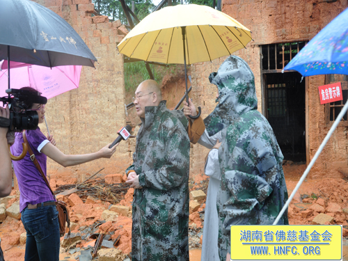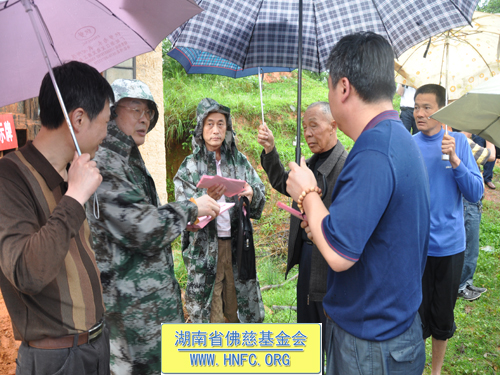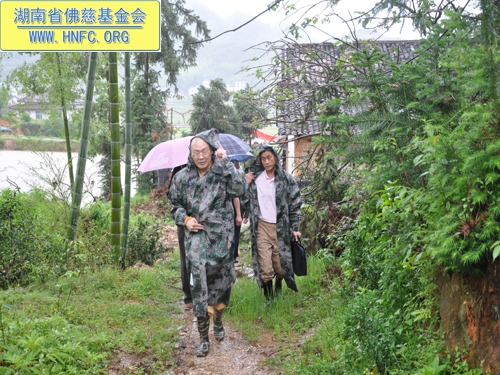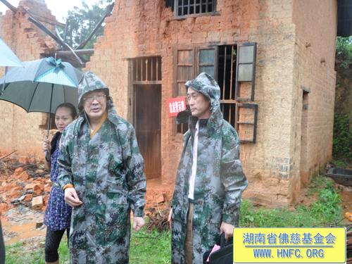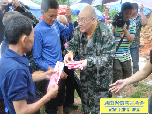 紧接着圣辉大和尚带领慈善一行人,冒着大雨走在泥泞的小路上,赶往平江县童市镇受灾地,看望慰问遭受4.28风雹灾害倒房的80户村民,在受灾现场给予每户300元,以及大米30斤,共捐助善款3万元。并捐赠了新衣物和生活日用品。