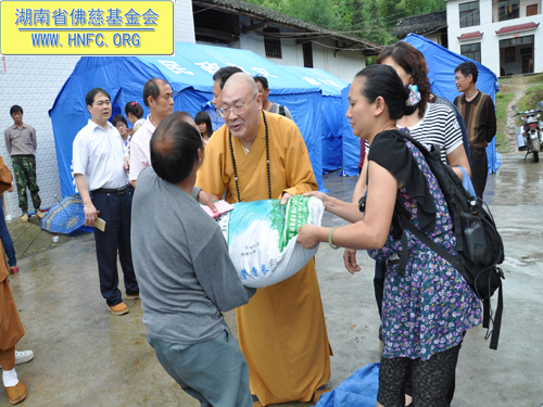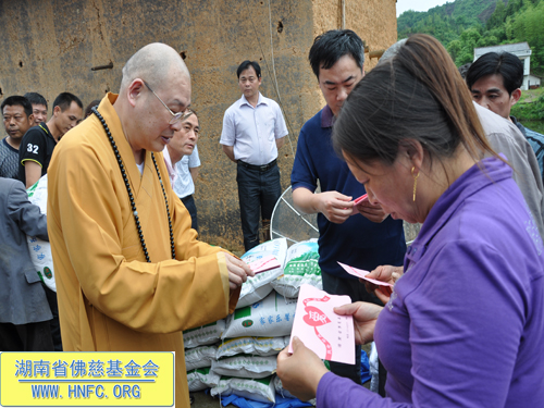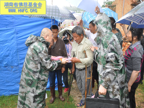 下午圣辉大和尚又带领慈善一行人又赶往平江县浯口镇,在受灾现场对遭受4.28风雹灾害倒房的35户村民,给予每户300元,以及大米50斤,共资助善款1.3万元。还捐赠了体恤衫115件。