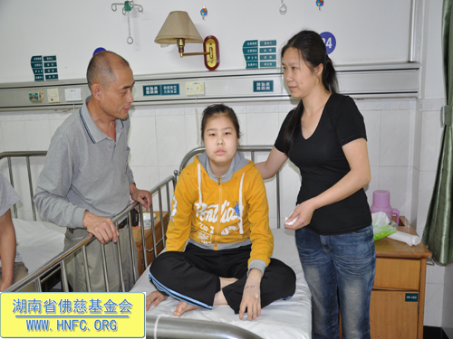 居住在祁东县凤石堰镇邓公村6村,13岁的刘依婷,今年四月在长沙市湘雅附一医院确诊为急性白血病,急需进行化疗。刘依婷的父母是祁东县的农民,家庭本来就经济困难。巨额的医疗费用迫使她父母四处借钱。圣辉大和尚得知情况后,嘱咐湖南省佛慈基金会资助患重病的刘依婷。她年纪尚小,祝愿她早日恢复健康。