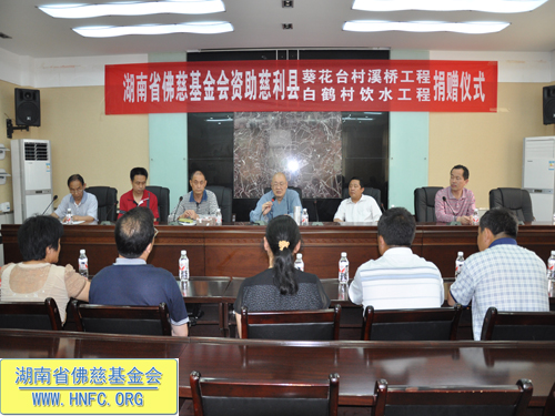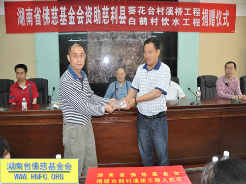 慈善行一行人到达张家界市慈利县,在慈利县民政局会议室举行捐赠仪式。会长圣辉大和尚代表湖南省佛慈基金会,给予慈利县国太桥乡白鹤村修建饮水工程捐赠5万元,另向慈利县通津铺镇葵花台村张凸组修建便民桥捐赠5万元。圣辉大和尚在会上叮呤和嘱咐要把捐赠的善款用好,并要当地政府监督两项工程顺利完成以及善款切实落实到位,把饮水工程建好,让村民饮用上安全卫生的水,还要把便民桥建好,促进当地经济发展,方便村民出行和利于学生上学。