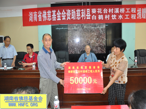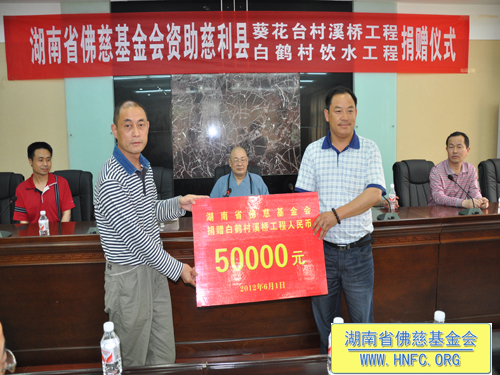 2012年5月31日,全国人大代表、中国佛教协会副会长、湖南省佛教协会会长、湖南省佛慈基金会会长圣辉大和尚带领湖南省佛慈基金会2012救灾助困助学慈善行一行马不停蹄,第十站到达张家界市慈利县,资助慈利县国太桥乡白鹤村修建饮水工程,同时资助慈利县通津铺镇葵花台村张凸组修建便民桥。
