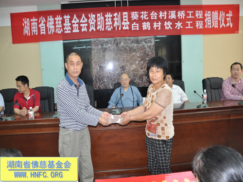参加捐赠仪式的有:两个工程的村支书及数名村民代表,湖南省佛慈基金会周仲山秘书长,慈利县政府副县长吴仁铣,慈利县民宗局长刘德云,慈利县民政局长杨年耀等。