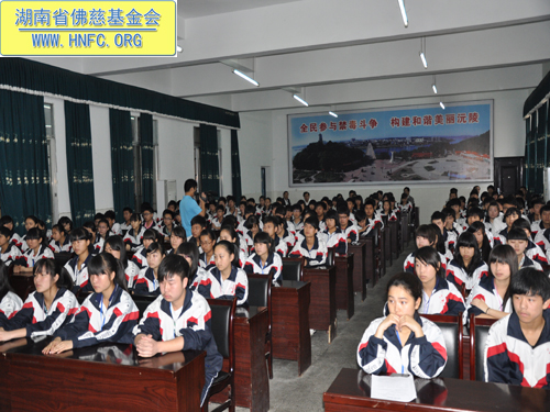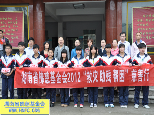 参加此次捐赠仪式的有:县委常委、组织部长、统战部长贺庆玲,分管教育的莫小平副县长,湖南省佛慈基金会周仲山秘书长,县统战部副部长孙国好,县宗教局长舒爱文,县教育局副局长张华秀,县二中校长周万水等。
