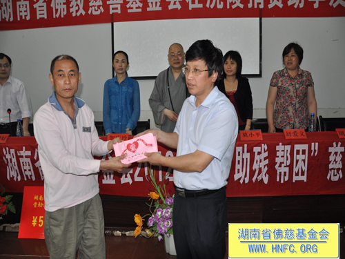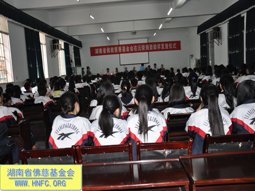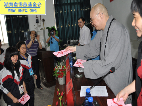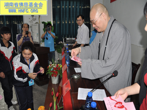 当天,沅陵县二中的会议室里座无虚席,捐赠仪式就在这里举行。100位学生静静地等待着省佛慈助学慈善行一行的到来。圣辉大和尚代表湖南省佛慈基金会向100位贫困学生,每人资助500元,共捐善款5万元。