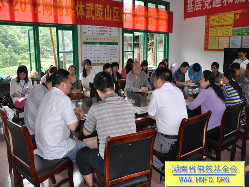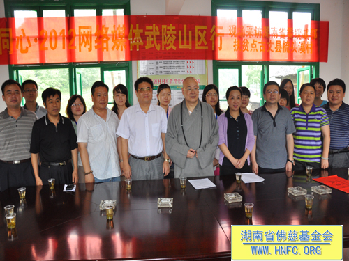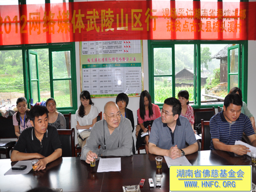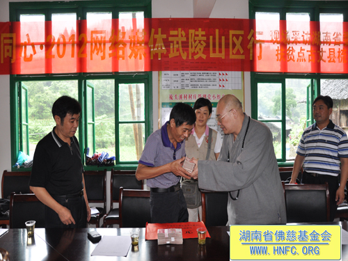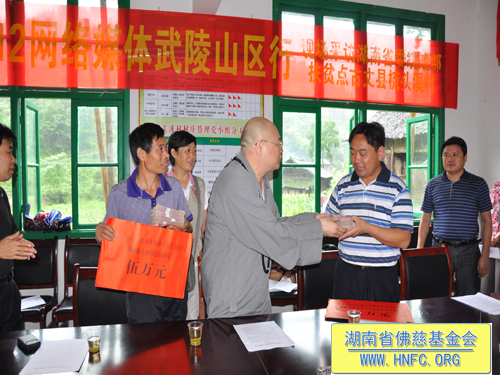 当天“同心.2012”中央统战部信息中心网络媒体,在武陵山区现场采访湖南省委统战部扶贫点湘西自治州古丈县双溪乡梳头溪村。湖南省佛慈基金会捐赠仪式也在现场举行,会长圣辉大和尚代表湖南省佛慈基金会,资助湘西自治州古丈县梳头溪村源头7组修路捐善款5万元,资助湘西自治州古丈县双溪乡中心完小学,购置新课桌椅捐善款5万元,共捐善款10万元。圣辉大和尚在会上讲话:希望梳头溪村源头7组早日把公路修好,改变村民生活全靠肩挑背扛的状况,利于村民把本地的土特产及茶叶运出去,把需要的种子化肥及日常用品运进来。即可改变村民的生活条件,又可造福当地老百姓把经济搞活,早日脱贫致富。还强调早日把双溪乡中心完小学的新课桌椅添置好,让学生们在好的环境下努力学习,将来学有所成回报社会。