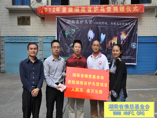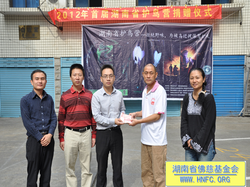 当天上午九点,湖南省佛慈基金会在省环保社团联合会前坪,举行了简短的捐款仪式。湖南省佛慈基金会向省环保社团护鸟营捐善款2万元,用于护鸟营志愿者实地保护候鸟安全迁徙和摄制制作宣传护鸟纪录片。另还捐1万元用于印制宣传护鸟的资料图片,向当地老百姓分发,呼吁大家来爱护可爱的候鸟,保护地球生态平衡,坚决抵制杀害候鸟的残酷行为。