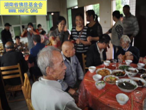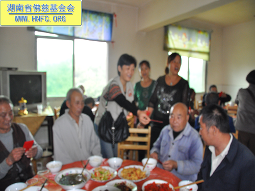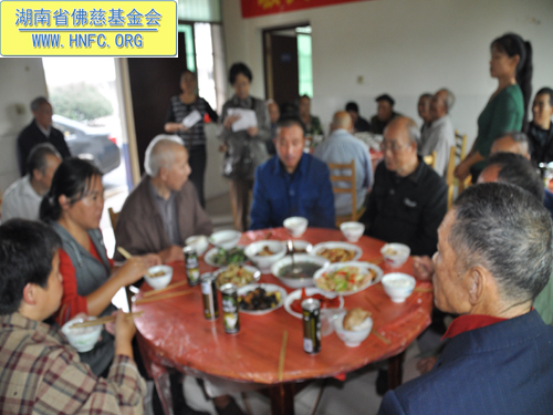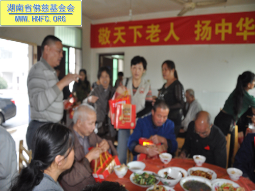 当天湘潭市佛教协会在湘潭市雨湖区长城乡敬老院“敬天下老人,扬中华美德”办素席7桌,宴请42位老人共庆中秋佳节,并给每位老人发了100元红包、中秋礼品一袋、电风扇、米以及油,还给老人们带去了念佛机。让老人们高高兴兴地提前度过了一个祥和愉快的节日。