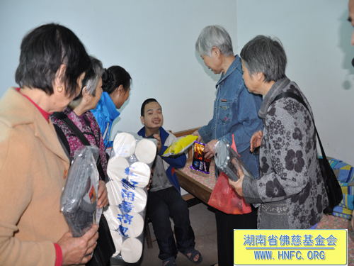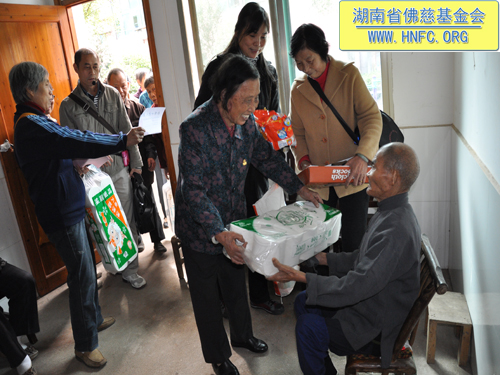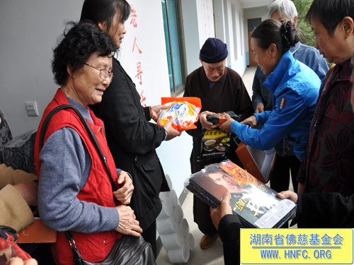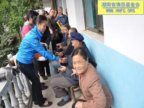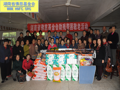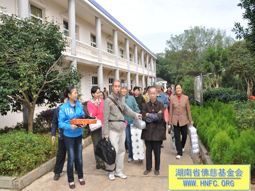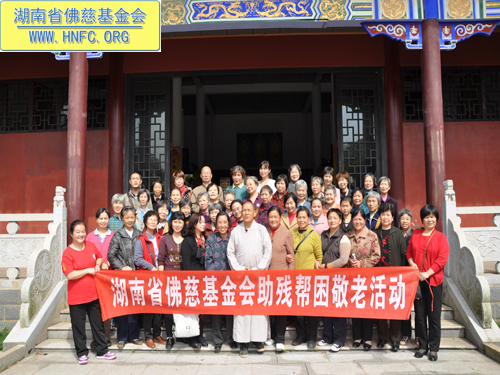 2012年10月23日,是农历九月初九重阳节。这天阳光明媚风和日丽,受湖南省佛慈基金会会长圣辉大和尚的嘱托,省佛慈基金会周仲山秘书长带领湘潭、株洲、长沙五十多位会员到汨罗崇善安养院看望慰问孤儿孤老,给他们带去了新内衣、毛袜、洗衣粉、卫生纸以及米和油等,折合善款四千多元。这些代表了省佛慈基金会众会员敬孤老的一点诚挚的心意。并祝愿孤老们重阳节快乐,幸福平安,健康长寿,愉快的安享晚年。
