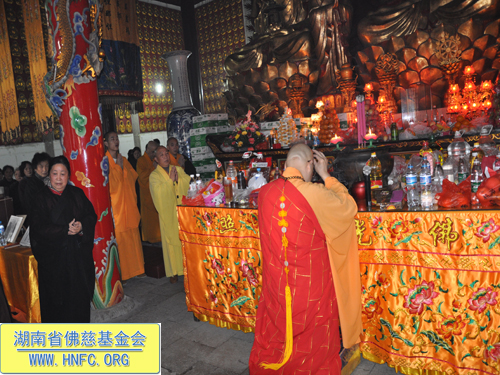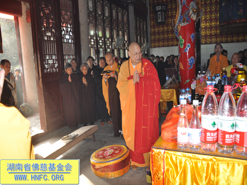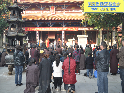早上九点法会正式开始,中国佛教协会副会长、湖南省佛教协会会长、古岳麓寺方丈、湖南省佛慈基金会会长圣辉大和尚在会上作了慈悲的开示,激励广大的省佛慈基金会会员们学药师佛的精神拔众生苦,用大悲心来行菩萨道,平时多做利益众生的善事,及时忏悔自己的业障,在利于自己的同时也度化别人。希望广大会员发大心,福慧双修,把每颗慈心凝聚成大爱,在行动上真正的广行菩萨道,不为名不为利,用无缘大慈,同体大悲的精神为社会做出应有的贡献。