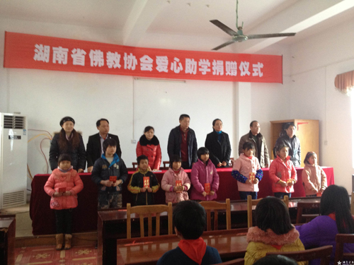 【解说】这次他再次践行他“日行一善”的慈善精神。在这里,他为我县古楼、十字、板桥、欧阳海、流峰、杨柳等乡镇的100名贫困学生捐赠了5万元善款,用于解决贫困学生的学习困难问题。