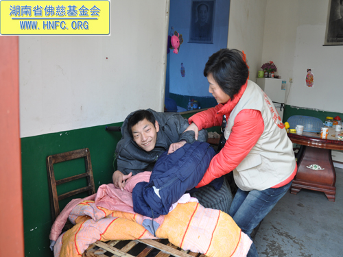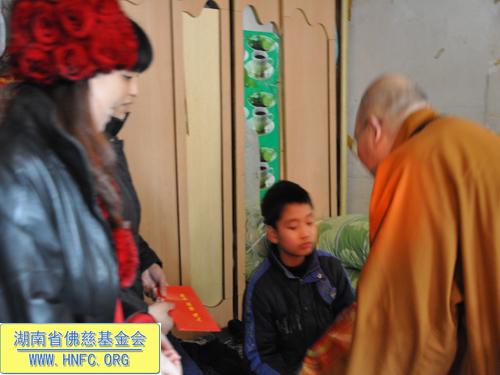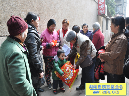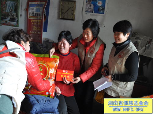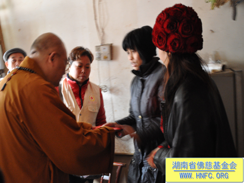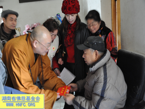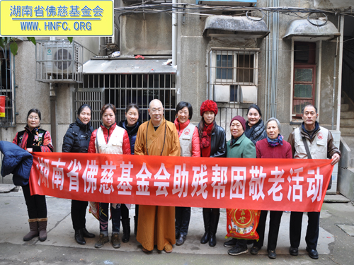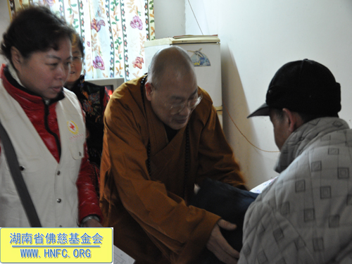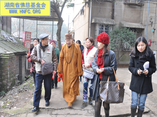 首先到长沙市赤岭路74号原长沙市化工机械厂职工宿舍,走访了几家特困家庭。圣辉大和尚看到社区里特困家庭的生活特别困苦,立即表示湖南省佛慈基金会在2013年底,启动省佛慈博爱送万家活动,把关爱和爱心款项亲自送到长沙市各社区孤老残疾特困家庭中。爱心于善行中见真情
