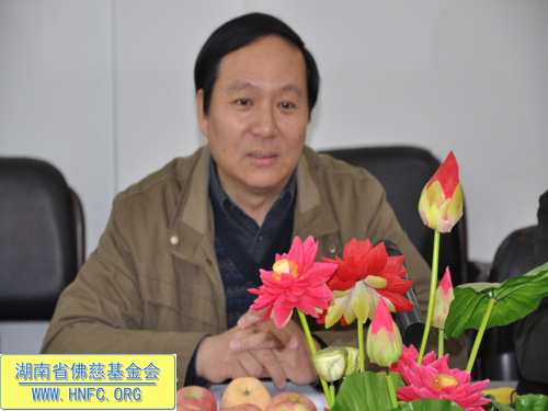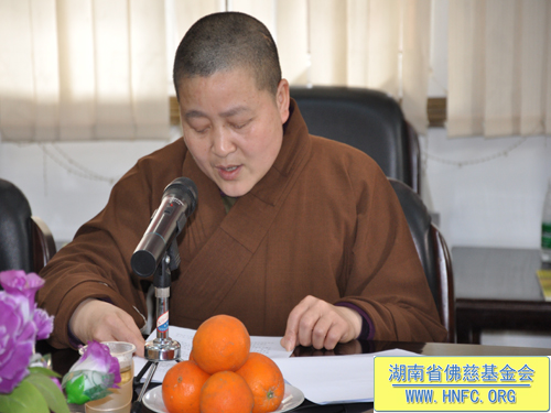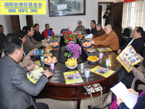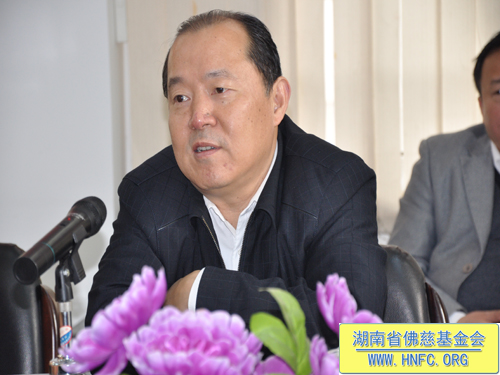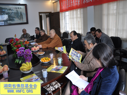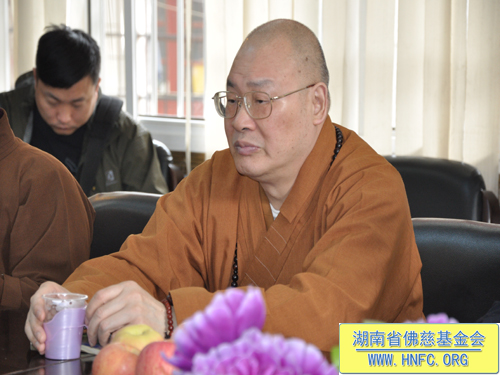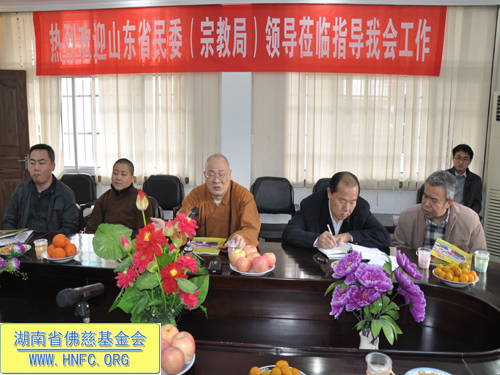 紧接着湖南省佛慈基金会能净常务副会长在会上向山东省宗教局领导一行就我会慈善工作,做了汇报:我会现有会员一万多人。十多年来我会对本省十几个地区救灾、助学、救助孤老孤儿、救助麻风病人,助残帮困,建桥、修路、修水库等,至今已捐善款达3114.1万元,捐救灾物资几百万元。圣辉大和尚本人多次给弱势群体捐钱。去年我会在长沙市五个街道成立无障碍社区助残帮困,一对一上门帮扶。我会还成立了第一个候鸟环保志愿者队伍,对省内迁徙候鸟进行保护。我会每年都向长沙市各个福利院捐钱和物品。