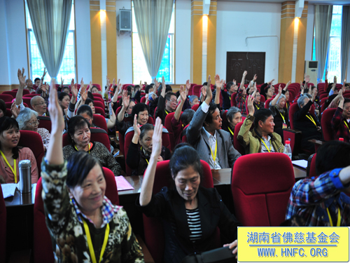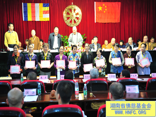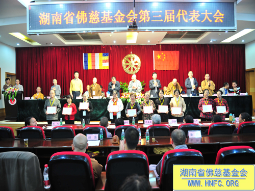 湖南省佛慈基金会第三届代表大会上,首先由能净副会长作第二届理事会工作汇报,由周仲山秘书长作第二届理事会财务情况汇报,紧接着由上级领导对我会做出特别贡献奖以及贡献奖的组长们颁发荣誉证书,此次颁奖是对我会组长们十几年来所做的慈善工作给予的肯定。此次会议严谨圆满。