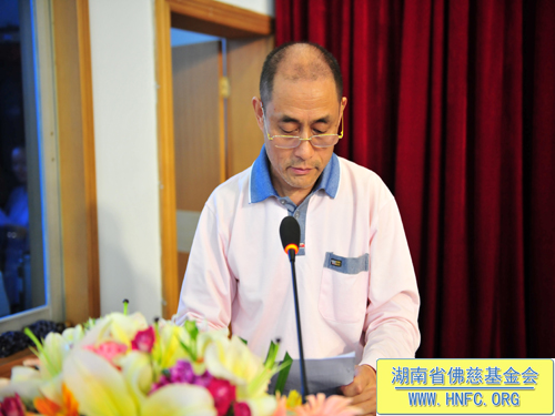 湖南省统战部邓焕生副部长在会上讲话:首先表示对大会的成功举办予以祝贺。湖南省佛慈基金会在圣辉大和尚的带领下,十多年来慈善捐款达三千多万元,我们很佩服这种坚持不懈地实干精神,还佩服圣辉大和尚在救灾的路途中,行囊里准备的干馒头和咸菜,这些都代表着对贫困众生的关爱之情。那里有灾难那里就有圣辉大和尚的身影。圣辉大和尚在实践中成就众生,体现了大慈悲的心境。省佛慈今天取得的成绩离不开大和尚的领导和无私的奉献。最后祝省佛慈基金会会办得更大更好。