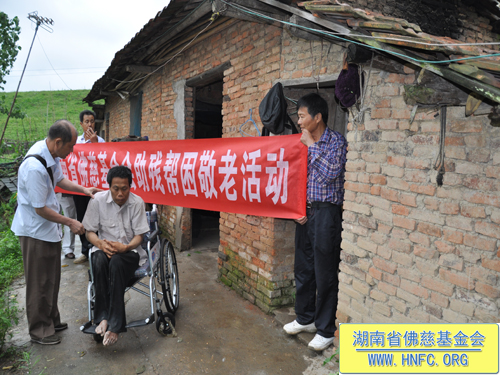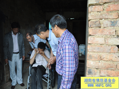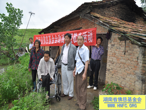2013年5月29日上午,湖南省佛慈基金会周仲山秘书长、湘阴县佛协伏小可秘书长、湘阴县常务理事李纳宇居士等一同前往湘阴县新泉镇群建村七组慰问资助特困残疾家庭。湘阴县众会员和新泉镇的会员共同资助1万3千多元,为这残疾特困家庭新建了一间房屋,同时还送去轮椅一张。